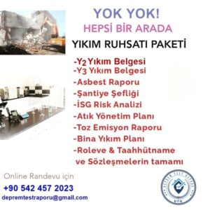 Kentsel Dönüşüme giren veya direk yıkımı yapılması planlanan yapılar Yıkım Ruhsatı almak zorunda. Bu yapıların yıkılması süreci de artık Yıkım Müteahhitliği kapsamında değerlendiriliyor. Bina yıkım ruhsatı Y1, Y2 ve Y3 belge ile yıkılabilmektedir. Bunlardan Y3 belgesi ile Zemin seviyesinden itibaren 13,50 mt yüksekliğe kadar olan binalarla sınırlıdır. Y2 belgesi ise Zemin seviyesinden itibaren bina yüksekliği 30,00 mt kadar olan yapıların yıkımını gerçekleştirmektedir. Y1 belgesinde ise yükseklik sınırı yoktur. Bizde bu belgelerin sadece Y2 ve Y3 belgeleri mevcuttur.