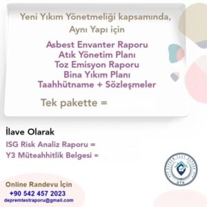 İnsan sağlığına verdiği zararlar ve tehditlerden dolayı Çevre ve Şehircilik Bakanlığı Kentsel Dönüşüme giren binalardan yıkım öncesinde bu testin yapılarak rapor halinde ilgili belediyeye verilmesi şartını getirmiştir. Biz bu testi de Türkiye’de ilk defa yapan firmalardan olarak bu alanda da öncülük ediyoruz.