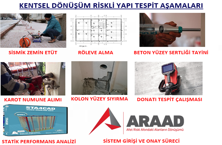 6306 sayılı Afet Riski Altındaki Alanların Dönüştürülmesi Hakkındaki Kanun (Kentsel Dönüşüm) kapsamında Çevre ve Şehircilik Bakanlığı Tarafından Riskli Yapı Tespit Lisanslı Firmamız üzerinden, Laboratuvar sürecinden başlayarak, ilgili belediyeden onaylatılması ve tapu müdürlüğünden yazılarının yazılmasına kadar sürecin takibini yapıyoruz.
